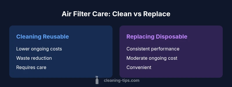 Maintaining clean indoor air starts with the air filter, and deciding between cleaning or replacing it is a common source of homeowner confusion. The choice directly affects air quality, HVAC efficiency, and long-term maintenance costs. According to Cleaning Tips, the right approach hinges on filter design, usage patterns, and manufacturer guidance. In practice, most homes see the clearest benefits from replacing a clogged or heavily soiled filter, but there are legitimate scenarios where a careful cleaning can extend life without compromising performance. Understanding when to clean vs. replace helps you avoid unnecessary labor, prevent reduced airflow, and stave off energy waste. For renters and homeowners alike, the decision often comes down to a few core questions: Is the filter washable? How dirty is it? What does the equipment require? By answering these questions, you can create an upkeep plan that keeps your air fresh, your system healthy, and your bills predictable.