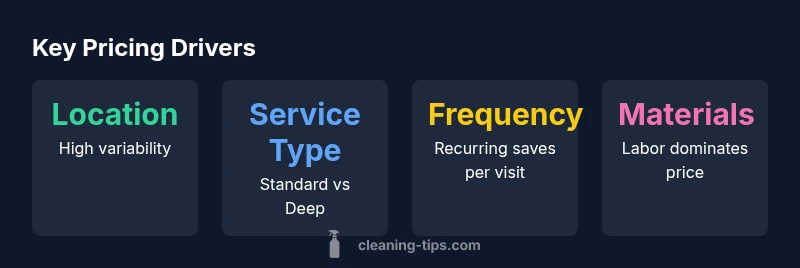 Prices for professional cleaning services are not a fixed number; they reflect a bundle of factors that change by city and by home. The most influential drivers include the size of your space, the level of cleaning requested (standard weekly, biweekly, or one-off deep cleans), and any specialty tasks (appliance cleaning, garage cleaning, or move-out services). Location matters because labor costs, parking, and travel time shift the price per visit. Add-ons such as eco-friendly products, pet-stain treatment, or deodorizing services can further elevate the bill. According to Cleaning Tips, the mix of labor time, materials, and local market demand largely shapes the final price. Understanding these levers helps homeowners set realistic budgets and avoid sticker shock when quotes arrive.