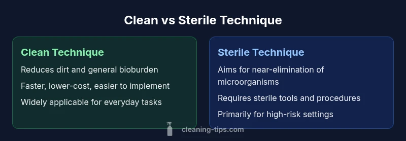 In everyday terms, clean technique focuses on removing dirt and reducing microbial presence using common cleaners, towels, and routine protocols that are practical for households. Sterile technique, by contrast, requires asepsis and sterile equipment to attempt to eliminate all microorganisms on a surface. The phrase <em>clean versus sterile technique</em> is often used to contrast ordinary sanitation with aseptic protocols. This distinction matters because most household tasks do not require sterile conditions, but they benefit from careful sanitation. According to Cleaning Tips, the goal of clean technique is to minimize risk through predictable routines, while sterile technique is reserved for tasks with higher risk or when contamination has severe consequences. The key is to align the method with the actual risk level of the task rather than blindly applying hospital-grade methods to every surface. In this guide, we explore how to apply both approaches appropriately, and what trade-offs each entails.