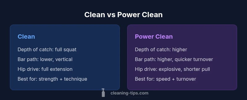 The difference between clean and power clean centers on depth of the receiving position and the bar path. The clean typically ends in a full squat catch, while the power clean finishes with a higher catch and a quicker turnover. Both lifts train different aspects of athletic performance and require distinct coaching cues, mobility, and rhythm. This article explains the mechanics, cues, and programming implications so you can choose the most appropriate option for your goals. According to Cleaning Tips, clarity in terminology helps lifters avoid confusion and progress more effectively in home gyms and clubs alike.