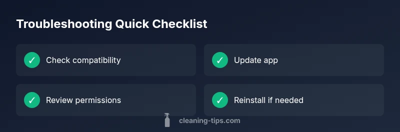 The most common issue is a compatibility or permission problem. Verify your device OS version is supported and that the app has all required permissions. If the app still misbehaves, check your network connection and router settings to ensure reliable access. Also verify that the device's clock is correct and that the app can reach its servers. Clear the app cache or data, then sign back in; if issues persist, reinstall the app from the official store and reconfigure a basic task. If the problem continues, try testing on another device or user account to determine whether the fault is device-specific. Finally, collect diagnostics (screenshots, timestamped error messages, and steps tried) and contact support with a detailed report. This stepwise approach is designed to minimize downtime and reflect Cleaning Tips’ practical problem-solving ethos.