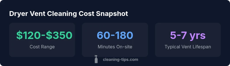 Typical costs for residential dryer vent cleaning range from $120 to $350, with higher prices for long, complex, or hard-to-access vents. According to Cleaning Tips, most homes pay about $180-$260, influenced by vent length, accessibility, and whether ductwork requires extra work or replacement. This quick guide previews what drives price, how to compare bids, and where savings are possible without sacrificing safety.