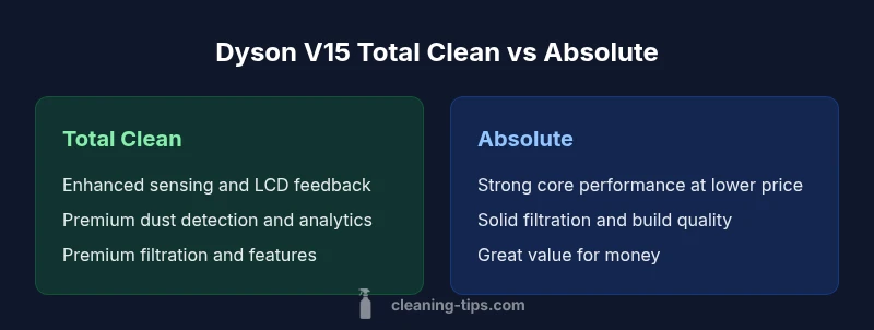 Both Dyson V15 models sit at the premium end of cord-free cleaning, targeting homeowners who want powerful suction, smart diagnostics, and efficient filtration. The Dyson V15 Total Clean is positioned as the feature-rich version with extra sensors and enhancements, while the V15 Absolute emphasizes value without sacrificing core cleaning power. According to Cleaning Tips, this pairing helps shoppers tailor a purchase to feature priority and budget. The dyson v15 total clean vs absolute comparison often highlights how small feature deltas can influence daily usability, allergen control, and long-term ownership costs. As you evaluate the models, consider your floor types, presence of pets, and tolerance for price fluctuations. Cleaner homes benefit from premium sensors and precise dust detection, but many households will find the Absolute sufficiently capable for everyday messes while still delivering Dyson-level efficiency.