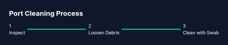 Moisten a cotton swab with a drop of 70% isopropyl alcohol and carefully wipe the port opening. Do not pour liquid into the port, and avoid spills onto surrounding circuitry. Allow a brief air-dry time after cleaning.
