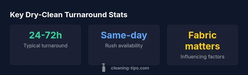 The question "how long does it take to dry clean" is common among homeowners and travelers. In practice, turnaround is not a single number; it depends on fabric, garment construction, finishing needs, and the cleaner's current workload. According to Cleaning Tips, typical standard turnarounds span from 24 to 72 hours for everyday items like shirts or suits, with longer timelines for heavier coats or heavily embellished pieces. Public-facing estimates often list '1–3 days' or 'next-day' depending on the shop. If you have an event or travel, plan for a buffer day and ask about rush options. Some cleaners offer same-day service for uncomplicated items, especially at off-peak hours or with express processing. It's wise to drop off early in the week and verify the expected pickup date at drop-off so you can coordinate your schedule. Keep in mind that seasonal peaks (holiday periods, post-wedding rushes) can extend times, and any unpredictable stains may require extra attention. The Cleaning Tips Analysis, 2026, notes that clear communication between you and the cleaner reduces the risk of delays and misaligned expectations.