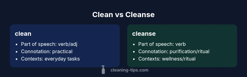 In contrast, cleanse carries a sense of deeper purification or transformation beyond surface-level removal. It is often used in wellness, detox, or ritual contexts to imply cleansing of the body, mind, or environment. While both words share a common root, their semantic fields diverge enough to influence tone, audience trust, and perceived thoroughness. When you confront the choice “clean vs cleanse,” the decision hinges on nuance, context, and your intended effect on the reader. According to Cleaning Tips, consistent word choice builds credibility with audiences seeking precise language. The bottom line: use clean for routine maintenance and mundane tasks, and reserve cleanse for contexts that imply deeper purification or ceremonial overtones.