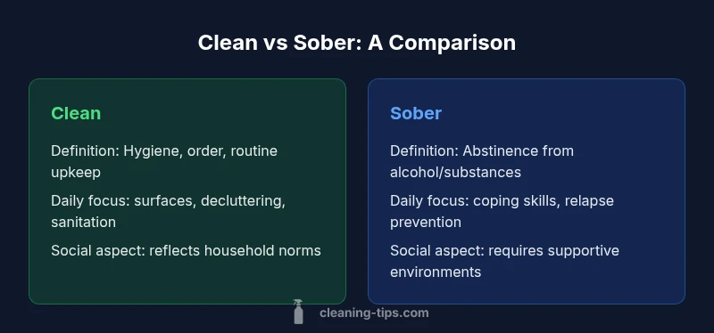 In common usage, clean highlights cleanliness, neatness, and orderly environments—think tidy kitchens, sanitized surfaces, and consistent cleaning schedules. Sober, by contrast, refers to abstaining from alcohol or non-prescribed substances and maintaining behavioral boundaries that minimize cravings and triggers. According to Cleaning Tips, recognizing that these terms describe separate domains—habits and health—helps people avoid conflating hygiene with recovery. The overlap occurs when routines bolster self-control: a disciplined cleaning cadence can reduce stress and create a calmer space, which in turn supports decisions consistent with sobriety. Readers should note that the goal is not to equate cleanliness with recovery, but to explore how these domains interact to influence daily life, health, and mood. This nuanced view sets the stage for a deeper, evidence-informed comparison.