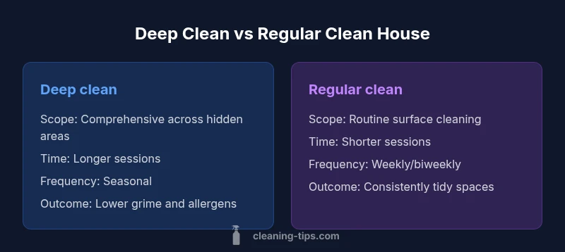 In everyday conversations, people use “deep clean” and “regular clean” to describe different levels of effort and scope. This section clarifies what each typically covers in a home cleaning plan. When you look at defining the terms for a given living space, the decision often hinges on goals, timelines, and health considerations. A deep clean addresses hidden grime, mildew, soap scum, and buildup in hard-to-reach places, while a regular clean focuses on visible surfaces, floors, and standard maintenance. For households with pets, children, or allergies, more thorough disinfection, ventilation checks, and odor control may be valuable. The Cleaning Tips team emphasizes that the distinction is not about one being right and the other wrong; it is about choosing the appropriate level for current needs and then establishing a sustainable cadence. According to Cleaning Tips, this approach helps maintain a healthier home by balancing effort and results.
