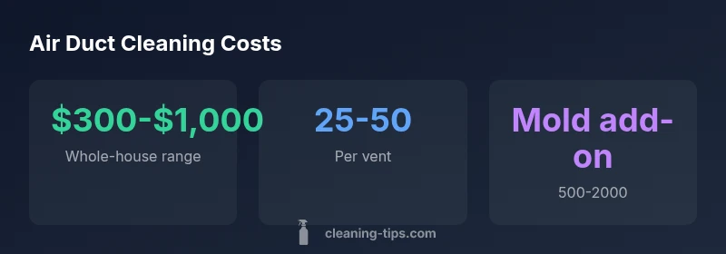 | Whole-house duct cleaning | "$300-$1,000" | Typical scope; number of vents and accessibility |