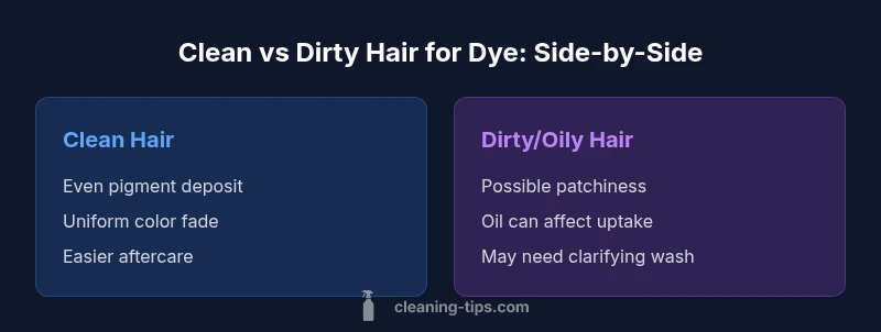 According to Cleaning Tips, is clean or dirty hair better to dye? The short answer is that clean hair typically yields more even color because a residue-free surface lets pigments deposit uniformly across each strand. Yet the landscape is nuanced. Some color systems and conditioning formulas incorporate oils or silicones that can alter uptake, and certain hair states—such as a light layer of natural oils or recent conditioning—may offer specific advantages for shine or gloss. This section builds a practical framework for deciding how to prepare hair for dyeing, so you can align your approach with the dye chemistry and your goals. The aim is not to label cleanliness as inherently good or bad, but to match your hair state to the product you are using. The Cleaning Tips team emphasizes that most traditional dyes perform best on clean hair, with caveats for specialty formulas and glossy finishes.