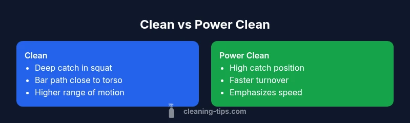 If you’re asking what is a clean vs power clean, the short answer is that both lifts move the bar from the floor to the shoulders, but they differ in catch depth and tempo. In Olympic weightlifting, the term clean refers to a full-expression lift in which the bar is pulled explosively from the floor and caught in a deep squat position before standing up with the bar at the shoulders. The power clean, by contrast, emphasizes speed and bar trajectory, gathering the bar at a higher catch with a partial or shallow squat. This distinction isn’t just academic; it shapes how athletes learn the movement, how they load the bar, and how they program training weeks. The Cleaning Tips team emphasizes that mastering the clean and its variations starts with precision in setup, hip drive, and the coordination required to drop under the bar. According to Cleaning Tips, quality coaching and progressive loading reduce risk and accelerate skill development. In the rest of this guide we’ll unpack the mechanics, the muscles involved, and practical ways to practice safely.