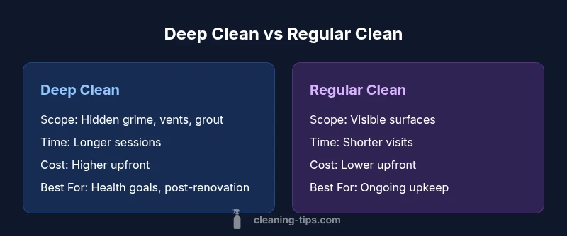 Explore how deep cleaning differs from regular cleaning, when to choose each, and practical steps to plan a thorough deep clean for a healthier home. Learn with insights from Cleaning Tips.