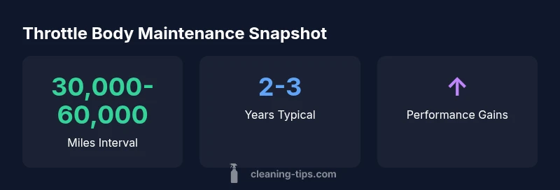 There is no one-size-fits-all answer, but practical guidelines help you plan maintenance. Many vehicles benefit from a clean throttle body every 30,000–60,000 miles, roughly corresponding to 2–3 years for typical commuting. If your driving includes many cold starts, short trips, or dusty roads, you may reach the need for cleaning closer to the 30,000-mile mark. Conversely, engines using high-quality fuel and clean air filters may extend toward 60,000 miles. Use symptoms as a reality check: when to clean throttle body should be considered if you experience rough idle, hesitation, surging, or reduced throttle response. Cleaning Tips analysis shows that aligning cleaning with your vehicle's service intervals reduces deposits and keeps fuel trim stable.
