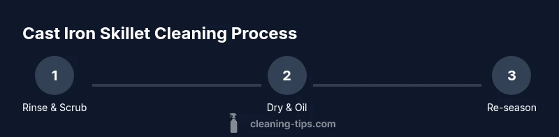 Cleaning a cast iron skillet is not just a rinse and wipe. The skillet relies on a delicate seasoning layer that creates a nonstick surface and protects against rust. The way you clean determines whether that seasoning stays intact or gets damaged. In the context of the keyword cast iron skillet how to clean, it’s essential to distinguish between bare cast iron and enamel-coated varieties, and between routine maintenance vs. deep cleaning after cooking acidic foods. According to Cleaning Tips, consistent cleaning without aggressive scrubbing helps preserve the seasoning and extend the pan's life. This article lays out practical methods, from no-soap routines to selective use of soap, plus drying, reseasoning, and storage best practices. By following these steps, you’ll keep your skillet ready for everyday cooking and easy to maintain between uses.
