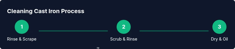 Most cooking residues on cast iron are dried fats and browned food bits. Start with hot water and a stiff brush to soften and lift the crust. For stubborn spots, sprinkle a small amount of kosher salt and scrub with a scrub brush; the salt acts as a gentle abrasive without removing the seasoning. Rinse again to remove any gritty grains, then dry thoroughly. Avoid soaking the pan for long periods, which can trap moisture and promote rust.