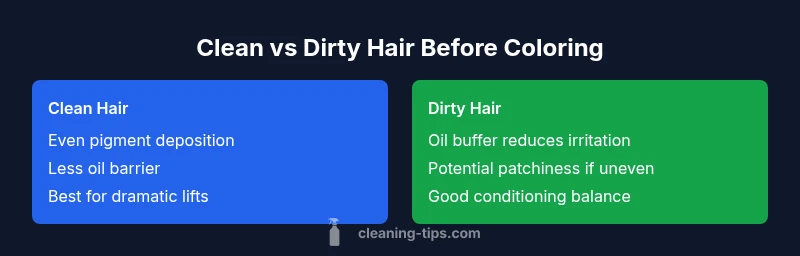 Compare clean vs dirty hair before coloring to understand pigment uptake, scalp comfort, and practical prep steps. Learn how hair state affects results, with expert guidance from Cleaning Tips for DIY color and salon services.