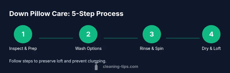 Down pillows use natural feathers for loft and warmth, which makes them exquisitely comfortable but sensitive to rough handling. The key to successful cleaning is respecting the pillow’s construction and the care label. Many down pillows are machine washable on a gentle cycle, but some require dry cleaning or spot treatment only. According to Cleaning Tips, understanding the fabric shell and fill type helps you tailor your approach and avoids clumping or loft loss. Look for words like laundering, washable, or dry-clean only on the tag. If the label allows machine washing, use a front-loading washer or a top-loading machine without an agitator to minimize agitation. Use warm water and a mild detergent designed for delicates, and avoid bleach and fabric softeners, which can strip loft and irritate sensitive skin. After washing, ensure the pillow is fully dry to prevent mildew and odors, as moisture trapped inside is the main enemy of down.