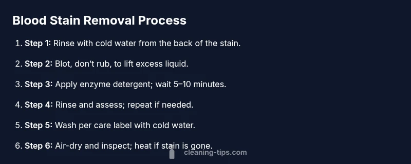 A blood stain is a protein-rich spill that can set when exposed to heat. The phrase what clean blood stain is often used to describe stains that are still fresh and treatable with basic household methods. According to Cleaning Tips, acting quickly and using cold water keeps pigment from permanently binding to fibers. A successful removal depends on fabric type, stain age, and the cleaning agents chosen. This guide focuses on practical, safe strategies you can apply at home, from everyday fabrics to delicate textiles, with an emphasis on avoiding damage rather than brute force. The goal is to restore appearance while preserving fiber integrity.