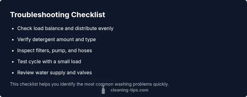 Based on Cleaning Tips analysis (2026), overload and detergent usage are frequent culprits, so start with the simplest checks. If the drum is clearly overloaded, remove items and run a test load with balanced distribution. If you notice residue, switch to the recommended amount and type of detergent for your machine.