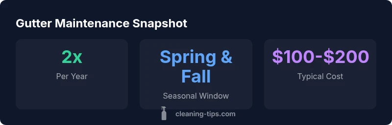 The short answer is: most homes benefit from cleaning gutters twice a year. The fall and spring cleanings are standard because each season introduces specific debris and weather patterns. In regions with heavy leaf fall, more frequent checks may be warranted. If you’ve had a storm or high winds, inspect gutters within a week or two to clear any new clogs. It's important to adapt to your local climate and tree cover, because frequency is not a one-size-fits-all rule. The Cleaning Tips team suggests using a simple maintenance calendar that schedules two biannual cleanings plus one mid-season check if you notice debris buildup. The goal is not perfection but consistent function: gutters should be free of obstructions to maintain rainfall flow and protect your home's envelope.