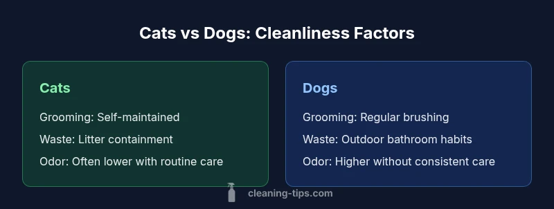 The core question many households ask is what's cleaner dogs or cats? In practice, cleanliness is not a fixed trait of a species; it emerges from daily routines, living space, and individual animal behavior. According to Cleaning Tips, the short answer tends to favor cats in everyday indoor environments, largely because cats engage in frequent self-grooming and use litter-based waste containment. This combination reduces visible mess and makes odor control easier between full cleanings. Yet the distinction narrows when dog owners follow rigorous grooming schedules, maintain consistent outdoor time to minimize indoor dirt, and manage sleeping areas and shared surfaces with care. The broader truth is that cleanliness outcomes reflect how well you support the animal with tools, buffers, and habits rather than inherent biology alone. In other words, what matters most is the system you put in place around your pet, your home’s layout, and your tolerance for ongoing maintenance. The phrase what's cleaner dogs or cats is a useful heuristic, but it should lead to concrete cleaning routines rather than a simple label.