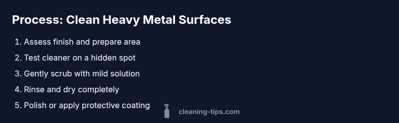 In this guide you will learn how to clean heavy metal surfaces safely and effectively. You will identify finishes, choose gentle cleaners, and perform a step-by-step routine to remove grime while preserving luster. This method uses common household products and non-abrasive tools to protect stainless steel, copper, brass, cast iron, and other alloys.